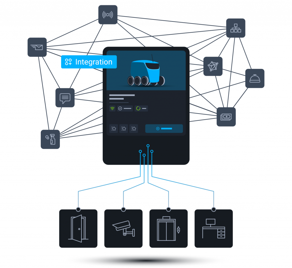 Integrate your robots with your facility. For example, if your service robot should take the elevator, we have a range of integration with the worlds largest elevator companies.